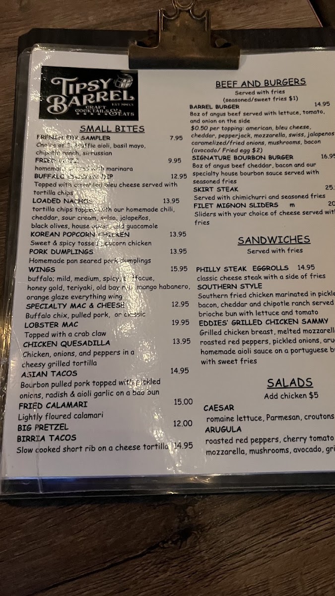 One standout feature of The Tipsy Barrel is its diverse menu that caters to various tastes. Here’s a quick look at some of the culinary delights awaiting you: